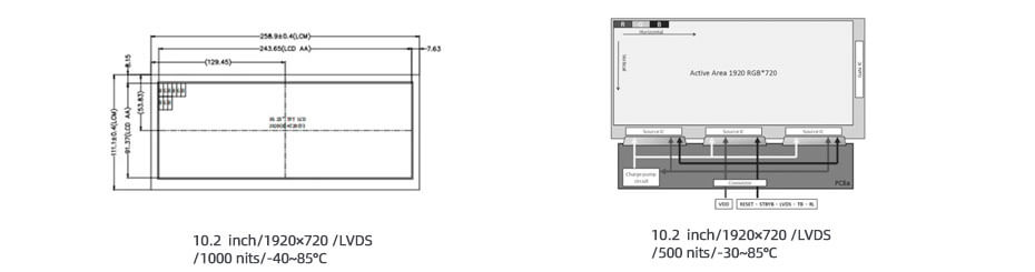 10.2 Inch Wide Temperature LCD Display 1920×720 LVDS -30°C to 85°C High Brightness 500nits TFT LCD Display.