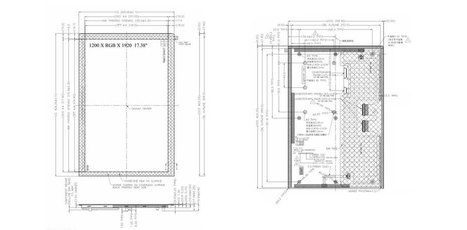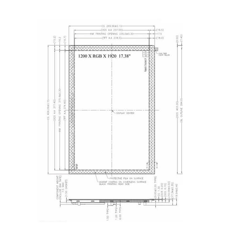 COG-PVLSHT022-01 supports display 1200(RGB)×1920 (WUXGA) with aspect ratio of 10:16 (W:H), whose pixels are arranged in RGB Vertical Stripe. It features active area of 234(W)×374.4(H) mm, outline size of 269.96(W)×404.26(H)×19.94(D) mm, with surface treament of Anti Fingerprint + Antiglare, Hard coating (7H), Reflection 1.8% (Typ.), net weight of 1.80Kgs (Typ.). As a ADS, Normally Black, Transmissive Assembly product, COG-PVLSHT022-01 can provides 950 cd/m² display brightness 1200:1 transimissive contrast ratio, 85/85/85/85 (Typ.)(CR≥10) (L/R/U/D) viewing angle, best view direction on Symmetry , and response time of 35 (Typ.)(Tr+Td) ms. Gray scale or the brightness of the sub-pixel is determined with a 8-bit gray scale signal for each dot, thus presenting a palette of 16.7M colors, also with performance of color gamut 75% (NTSC). This product adopted WLED as it's backlight systerm which was placed as Edge light type and have a working life time of 20K hours, external backlight driver is additionally needed. COG-PVLSHT022-01 utilizes LVDS (2 ch, 8-bit) as it's signal inputting systerm, which connected by 50 pins Connector with power supply voltage of 4.2V (Typ.). It's typical vertical frame rate (Fv) is 60Hz.