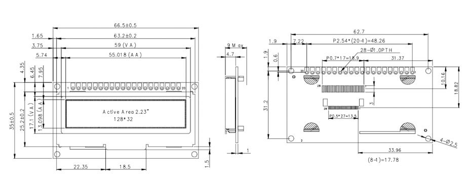 ET223-12832X001-P20 is a 2.2 inch diagonal stretched bar LCD display screen product. ET223-12832X001-P20 supports a display resolution of 128×32, whose pixels are arranged in a standard RGB stripe configuration. It features an active area of 55.018(W) × 13.098(H) mm and an outline dimension of 66.5(W) × 35(H) mm. The module adopts a transmissive display mode and supports a CPU/RGB interface for communication. ET223-12832X001-P20 provides a typical display brightness of 450 cd/m² and offers a wide viewing angle of 80/80/80/80 (L/R/U/D) for clear visibility from multiple directions. Designed for wide temperature applications, it supports an operating temperature range of -40°C to 80°C and a storage temperature range of -40°C to 85°C. This display module does not include a touch panel.