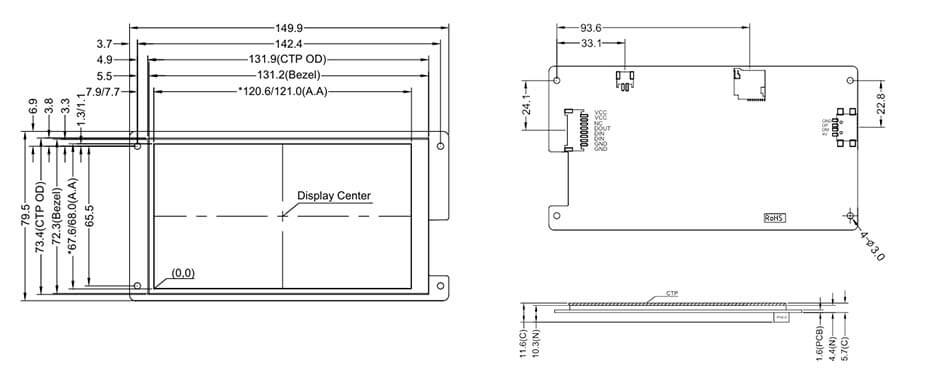 Capacitive screen: 120.6mmx67.6 mm; non-touch: 121.0mmx68.0mm