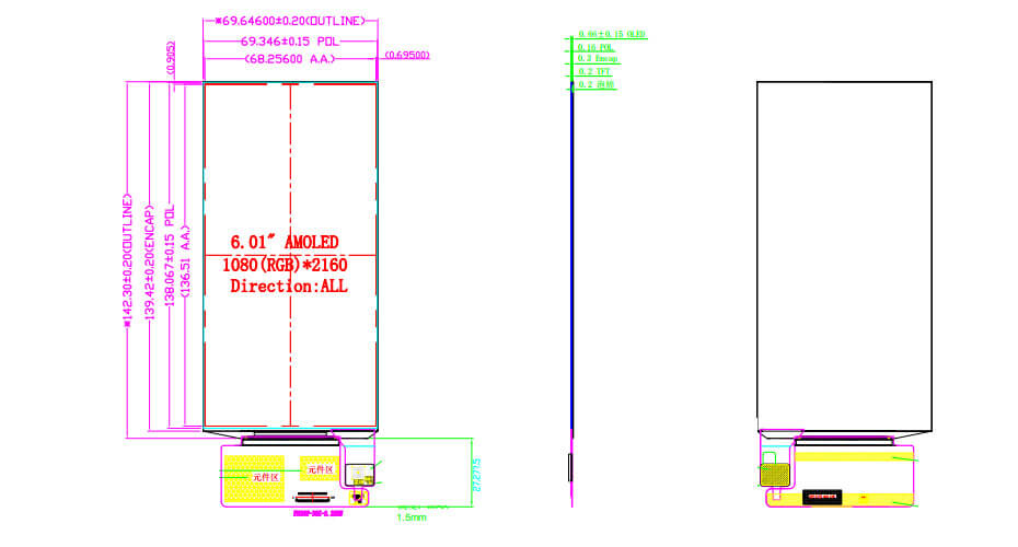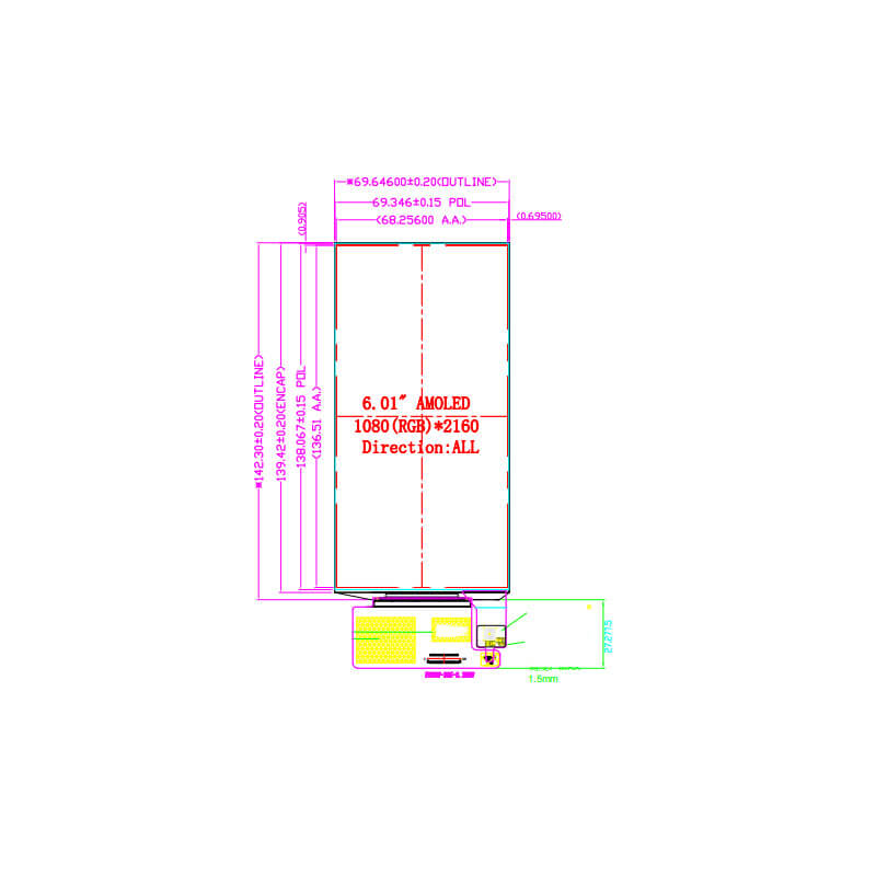 ET6D0103 is a 6.1 inch diagonal AMOLED display screen product, featuring self-emissive technology. ET6D0103 supports a resolution of 1080×2160 with an approximate 9:18 aspect ratio (W:H) and offers viewing angles of 80/80/80/80 (L/R/U/D). It features an active area of 68.256(W) × 136.51(H) mm and an outline dimension of 69.646(W) × 142.3(H) mm, and adopts a MIPI interface for signal transmission. The display operates within a temperature range of -20°C to 70°C (storage: -30°C to 80°C). Designed without a touch function, ET6D0103 is suitable for handheld PDA applications requiring high-resolution display performance.