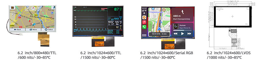 6.2 Inch Wide Temperature LCD Display 1024×600 LVDS -30°C to 85°C High Brightness 1000nits TFT LCD Display.