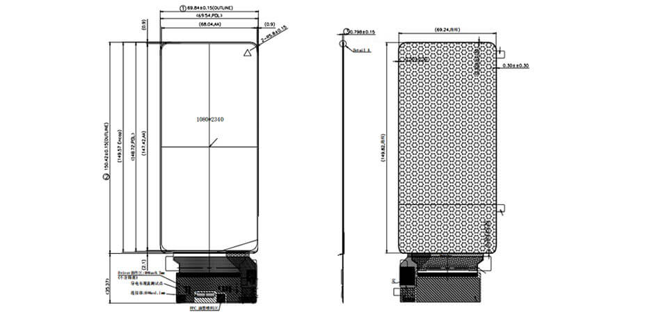 ET064AM03-WT is a 6.4 inch diagonal AMOLED display screen product, featuring self-emissive technology. ET064AM03-WT supports a resolution of 1080×2340 with an approximate 19.5:9 aspect ratio (W:H) and offers viewing angles of 80/80/80/80 (L/R/U/D). It features an active area of 68.04(W) × 147.42(H) mm and an outline dimension of 69.84(W) × 150.42(H) × 0.798(D) mm, and adopts a MIPI interface for signal transmission. The display provides a brightness of 430 nits and operates within a temperature range of -20°C to 70°C (storage: -40°C to 80°C). With integrated capacitive touch functionality, ET064AM03-WT is suitable for interactive applications requiring high-quality display performance.