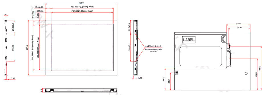 TX16D209VM0BAB is a 6.4 inch diagonal LTPS TFT-LCD display screen product from KOE, with a built-in WLED backlight, With LED Driver, without touch screen. TX16D209VM0BAB supports display 1024(RGB)×768 (XGA) with aspect ratio of 4:3 (W:H), whose pixels are arranged in RGB Vertical Stripe. It features active area of 129.792(W)×97.344(H) mm, outline size of 153(W)×118(H)×9.2(D) mm, viewing area size of 132.8(W)×100.34(H) mm, with surface treament of Glare (Haze 0%), net weight of 190g (Typ.). As a IPS, Normally Black, Transmissive LCM product, TX16D209VM0BAB can provides 1400 cd/m² display brightness 1500:1 transimissive contrast ratio, 85/85/85/85 (Typ.)(CR≥10) (L/R/U/D) viewing angle, best view direction on Symmetry , and response time of 30 (Typ.)(Tr+Td) ms. Gray scale or the brightness of the sub-pixel is determined with a 8-bit gray scale signal for each dot, thus presenting a palette of 16.7M colors, also with performance of color gamut 60% (NTSC). This product adopted WLED as it's backlight systerm which was placed as Edge light type and have a working life time of 70K hours, With LED Driver. TX16D209VM0BAB utilizes LVDS (1 ch, 8-bit) as it's signal inputting systerm, which connected by 20 pins Connector with power supply voltage of 3.3V (Typ.). It's typical vertical frame rate (Fv) is 60Hz.