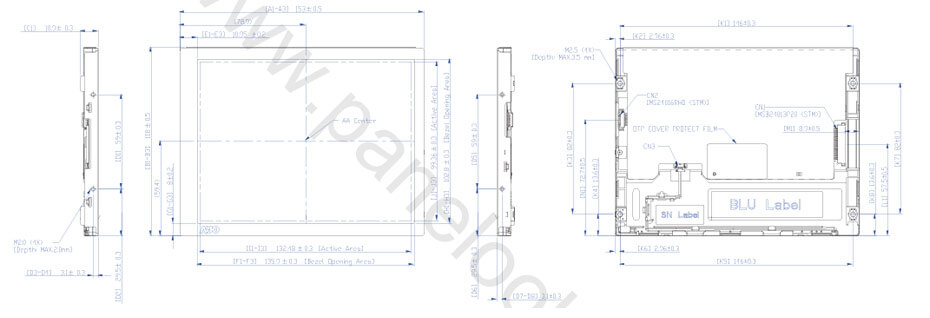 G065VN01 V221 is a 6.5 inch diagonal a-Si TFT-LCD display screen with a built-in WLED backlight, With LED Driver, without touch screen.G065VN01 V221 supports display 640(RGB)×480 (VGA) with aspect ratio of 4:3 (W:H), whose pixels are arranged in RGB Vertical Stripe. As for mechanical detail, it features active area of 132.48(W)×99.36(H) mm, outline size of 153(W)×118(H)×11.2(D) mm, viewing area size of 135.9(W)×102.8(H) mm, with surface treament of Antiglare, Hard coating (3H), Antireflection, net weight of 170g (Typ.). As a AHVA, Normally Black, Transmissive LCM product, G065VN01 V221 can provides 800 cd/m² display brightness 1000:1 transimissive contrast ratio, 89/89/89/89 (Typ.)(CR≥10) (L/R/U/D) viewing angle, best view direction on Symmetry , and response time of 10/15 (Typ.)(Tr/Td) ms. Gray scale or the brightness of the sub-pixel is determined with a 6-bit / 6-bit + FRC gray scale signal for each dot, thus presenting a palette of 262K/16.2M colors, also with performance of color gamut 55% (NTSC). This product adopted WLED as it's backlight systerm which was placed as Edge light type (Bottom side) and have a working life time of 70K hours, With LED Driver. G065VN01 V221 utilizes LVDS (1 ch, 6/8-bit) as it's signal inputting systerm, which connected by 20 pins Connector with power supply voltage of 3.3V (Typ.). It's typical vertical frame rate (Fv) is 60Hz.