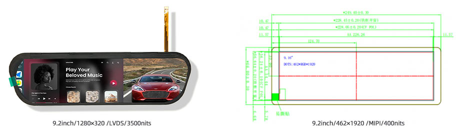 9.2 Inch Stretched Bar Display 1280x320 IPS LVDS 3500nits High Brightness Wide Temperature TFT LCD Display.