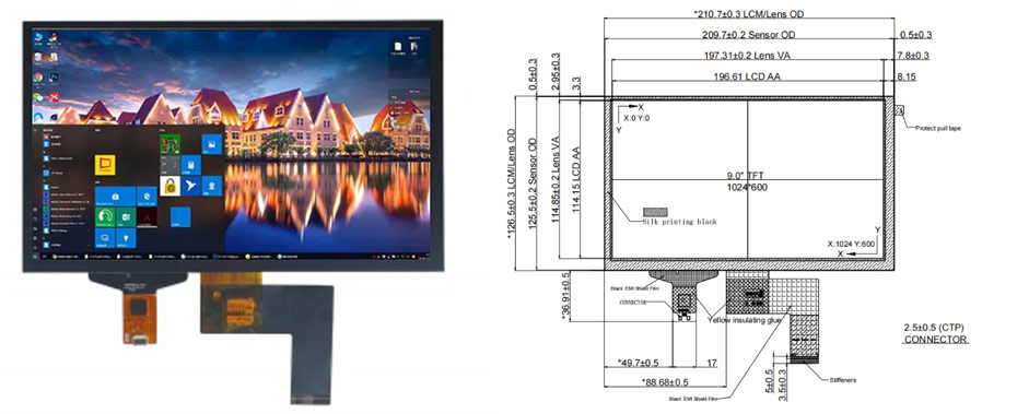 ET090WS01-KDT (1024x600, LVDS ,1000nits, -20~70°C, 210.7x126.5mm, CTP)