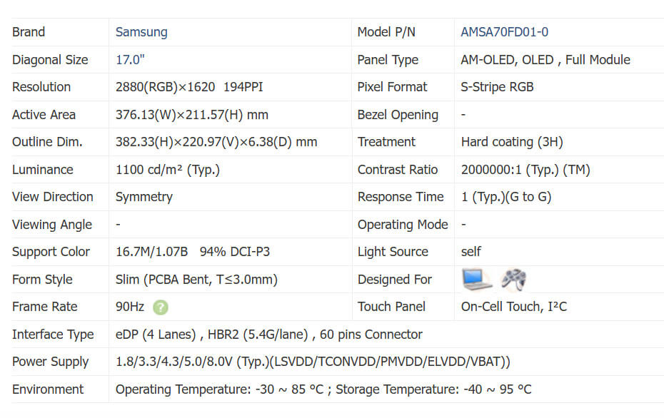 AMSA70FD01-0 is a 17.0 inch diagonal AM-OLED display screen product from Samsung, it self emiting, touchscreen On-Cell Touch.AMSA70FD01-0 supports display 2880(RGB)×1620 with aspect ratio of 16:9 (W:H), whose pixels are arranged in S-Stripe RGB.It features active area of 376.13(W)×211.57(H) mm, outline size of 382.33(W)×220.97(H)×6.38(D) mm, with surface treament of Hard coating (3H), net weight of 372g (Typ.), shape stype of Slim (PCBA Bent, T≤3.0mm). AMSA70FD01-0 can provides 1100 cd/m² display brightness 2000000:1 transimissive contrast ratio, best view direction on Symmetry , and response time of 1 (Typ.)(G to G) ms. Gray scale or the brightness of the sub-pixel is determined with a 6-bit / 8-bit gray scale signal for each dot, thus presenting a palette of 16.7M/1.07B colors, also with performance of color gamut 94% (DCI-P3). This product emiting itself . AMSA70FD01-0 utilizes eDP (4 Lanes) as it's signal inputting systerm, which connected by 60 pins Connector with power supply voltage of 1.8/3.3/4.3/5.0/8.0V (Typ.)(LSVDD/TCONVDD/PMVDD/ELVDD/VBAT)). It's typical vertical frame rate (Fv) is 90Hz.