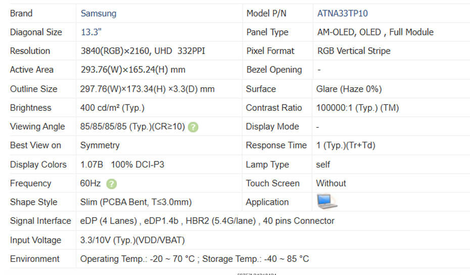 ATNA33TP10 is a 13.3 inch diagonal AM-OLED display screen product, it self emiting, without touch screen.ATNA33TP10 supports display 3840(RGB)×2160 (UHD) with aspect ratio of 16:9 (W:H), whose pixels are arranged in RGB Vertical Stripe, according to calculation of Panelook it's pixel density is 332 PPI. It features active area of 293.76(W)×165.24(H) mm, outline size of 297.76(W)×173.34(H)×3.3(D) mm, with surface treament of Glare (Haze 0%), net weight of 154g (Max.), shape stype of Slim (PCBA Bent, T≤3.0mm). ATNA33TP10 can provides 400 cd/m² display brightness 100000:1 transimissive contrast ratio, 85/85/85/85 (Typ.)(CR≥10) (L/R/U/D) viewing angle, best view direction on Symmetry , and response time of 1 (Typ.)(Tr+Td) ms. Gray scale or the brightness of the sub-pixel is determined with a 8-bit + Hi-FRC gray scale signal for each dot, thus presenting a palette of 1.07B colors, also with performance of color gamut 100% (DCI-P3). This product emiting itself . ATNA33TP10 utilizes eDP (4 Lanes) as it's signal inputting systerm, which connected by 40 pins Connector with power supply voltage of 3.3/10V (Typ.)(VDD/VBAT). It's typical vertical frame rate (Fv) is 60Hz.