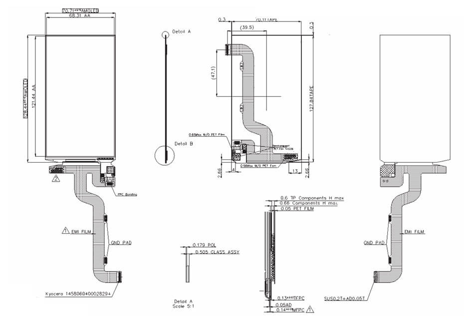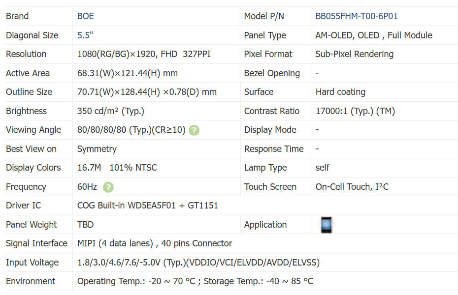 BB055FHM-T00-6P01 supports display 1080(RG/BG)×1920 (FHD) with aspect ratio of 9:16 (W:H), whose pixels are arranged in Sub-Pixel Rendering,it's pixel density is 327 PPI. As for mechanical detail, it features active area of 68.31(W)×121.44(H) mm, outline size of 70.71(W)×128.44(H)×0.78(D) mm, with surface treament of Hard coating, net weight of TBD. BB055FHM-T00-6P01 can provides 350 cd/m² display brightness 17000:1 transimissive contrast ratio, 80/80/80/80 (Typ.)(CR≥10) (L/R/U/D) viewing angle, best view direction on Symmetry . Gray scale or the brightness of the sub-pixel is determined with a 8-bit gray scale signal for each dot, thus presenting a palette of 16.7M colors, also with performance of color gamut 101% (NTSC). This product emiting itself . BB055FHM-T00-6P01 utilizes MIPI (4 data lanes) as it's signal inputting systerm, which connected by 40 pins Connector with power supply voltage of 1.8/3.0/4.6/7.6/-5.0V (Typ.)(VDDIO/VCI/ELVDD/AVDD/ELVSS). It's typical vertical frame rate (Fv) is 60Hz.