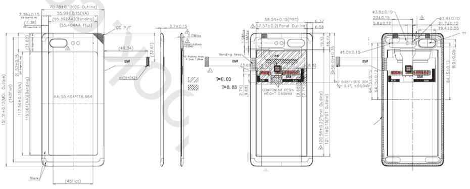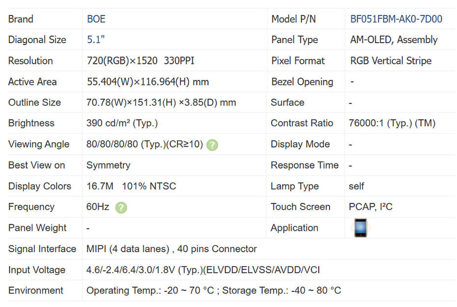 BF051FBM-AK0-7D00 is a 5.1 inch diagonal AM-OLED display screen, it self emiting, touchscreen PCAP. BF051FBM-AK0-7D00 supports display 720(RGB)×1520 with aspect ratio of 1:2 (W:H), whose pixels are arranged in RGB Vertical Stripe, according to calculation of Panelook it's pixel density is 330 PPI. As for mechanical detail, it features active area of 55.404(W)×116.964(H) mm, outline size of 70.78(W)×151.31(H)×3.85(D) mm. BF051FBM-AK0-7D00 can provides 390 cd/m² display brightness 76000:1 transimissive contrast ratio, 80/80/80/80 (Typ.)(CR≥10) (L/R/U/D) viewing angle, best view direction on Symmetry . Gray scale or the brightness of the sub-pixel is determined with a 8-bit gray scale signal for each dot, thus presenting a palette of 16.7M colors, also with performance of color gamut 101% (NTSC). This product emiting itself . BF051FBM-AK0-7D00 utilizes MIPI (4 data lanes) as it's signal inputting systerm, which connected by 40 pins Connector with power supply voltage of 4.6/-2.4/6.4/3.0/1.8V (Typ.)(ELVDD/ELVSS/AVDD/VCI. It's typical vertical frame rate (Fv) is 60Hz.