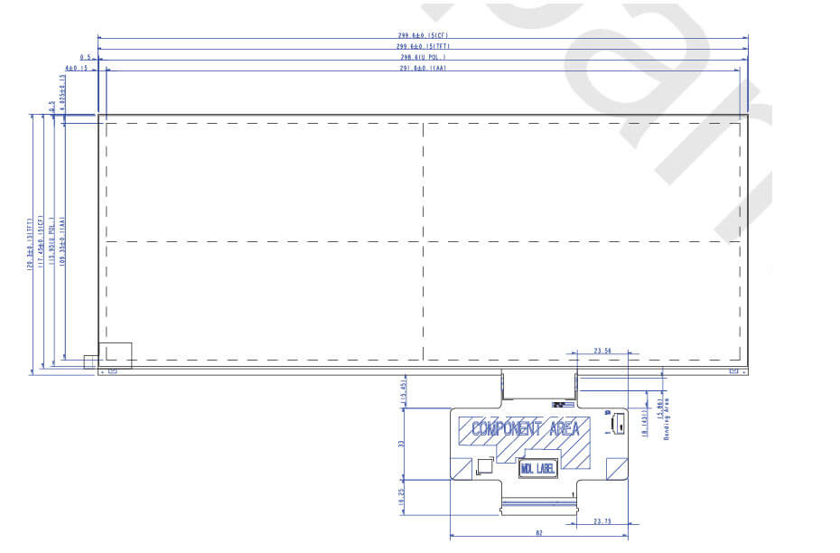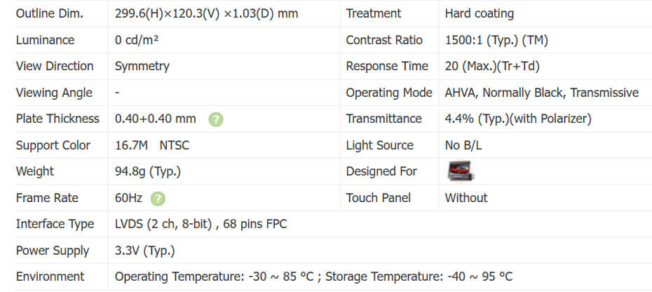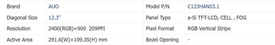 C123HAN03.1 supports display 2400(RGB)×900 with aspect ratio of 8:3 (W:H), whose pixels are arranged in RGB Vertical Stripe. It features active area of 291.6(W)×109.35(H) mm, outline size of 299.6(W)×120.3(H)×1.03(D) mm, with surface treament of Hard coating, net weight of 94.8g (Typ.), utilizing 0.40+0.40 mm mm plate. As a AHVA, Normally Black, Transmissive CELL product, C123HAN03.1 can provides 1500:1 transimissive contrast ratio, best view direction on Symmetry , and response time of 20 (Max.)(Tr+Td) ms. Gray scale or the brightness of the sub-pixel is determined with a 8-bit gray scale signal for each dot, thus presenting a palette of 16.7M colors. This product have no backlight. C123HAN03.1 utilizes LVDS (2 ch, 8-bit) as it's signal inputting systerm, which connected by 68 pins FPC with power supply voltage of 3.3V (Typ.). It's typical vertical frame rate (Fv) is 60Hz.