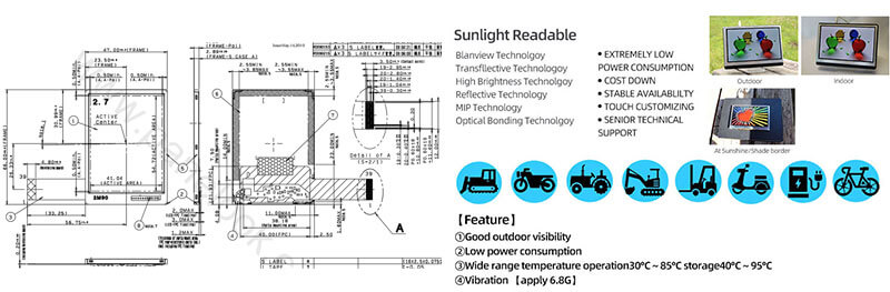 COM27H2M95XLC supports display 240(RGB)×320 (QVGA) with aspect ratio of 3:4 (W:H), whose pixels are arranged in RGB Vertical Stripe.It features active area of 41.04(W)×54.72(H) mm, outline size of 47(W)×66(H)×4.34(D) mm, with surface treament of Hard coating (3H), net weight of 19.0g (Typ.). As a TN, Normally White, Transflective LCM product, COM27H2M95XLC can provides 400 cd/m² display brightness 400:1 transimissive contrast ratio, 8.5:1 (Typ.) reflective contrast ratio, 80/80/80/80 (Min.)(CR≥10) (L/R/U/D) viewing angle , and response time of 40/60 (Max.)(Tr/Td) ms. Gray scale or the brightness of the sub-pixel is determined with a 6-bit gray scale signal for each dot, thus presenting a palette of 262K colors.