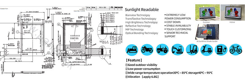 COM27H2P40ULC is a 2.7 inch diagonal a-Si TFT-LCD display screen product, with an incorporated WLED lighting system, without backlight driver, without touch screen.COM27H2P40ULC supports display 240(RGB)×320 (QVGA) with aspect ratio of 3:4 (W:H), whose pixels are arranged in RGB Vertical Stripe. As for mechanical detail, it features active area of 41.04(W)×54.72(H) mm, outline size of 47(W)×66(H)×4.34(D) mm, with surface treament of Hard coating (2H), net weight of 19.0g (Typ.). As a VA, Normally Black, Transflective LCM product, COM27H2P40ULC can provides 350 cd/m² display brightness 800:1 transimissive contrast ratio, 2:1 (Typ.) reflective contrast ratio, 80/80/80/80 (Min.)(CR≥10) (L/R/U/D) viewing angle, best view direction on Symmetry , and response time of 60/40 (Max.)(Tr/Td) ms.
