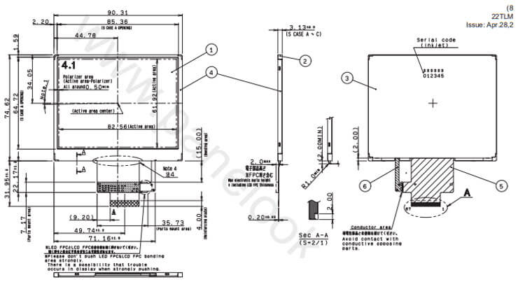 COM41H4P21ULC is a 4.1 inch diagonal a-Si TFT-LCD display screen product, with an incorporated WLED lighting system, without backlight driver, without touch screen.COM41H4P21ULC supports display 320×240(RGB) (QVGA) with aspect ratio of 4:3 (W:H), whose pixels are arranged in RGB Horizontal Stripe.It features active area of 82.56(W)×61.92(H) mm, outline size of 90.31(W)×74.62(H)×3.43(D) mm, viewing area size of 85.36(W)×64.72(H) mm, with surface treament of Hard coating (2H), net weight of 42.0g (Typ.). As a VA, Normally Black, Transflective LCM product, COM41H4P21ULC can provides 500 cd/m² display brightness 800:1 transimissive contrast ratio, 80/80/80/80 (Min.)(CR≥10) (L/R/U/D) viewing angle, best view direction on Symmetry , and response time of 100 (Max.)(Tr+Td) ms. Gray scale or the brightness of the sub-pixel is determined with a 8-bit gray scale signal for each dot, thus presenting a palette of 16.7M colors, also with performance of color gamut 50% (NTSC). This product adopted 5S2P WLED as it's backlight systerm which was placed as Edge light type and have a working life time of 50K hours, external backlight driver is additionally needed. COM41H4P21ULC utilizes Parallel RGB (1 ch, 8-bit) as it's signal inputting systerm, which connected by 67 pins FPC with power supply voltage of 3.0V (Typ.). It's typical vertical frame rate (Fv) is 60Hz.