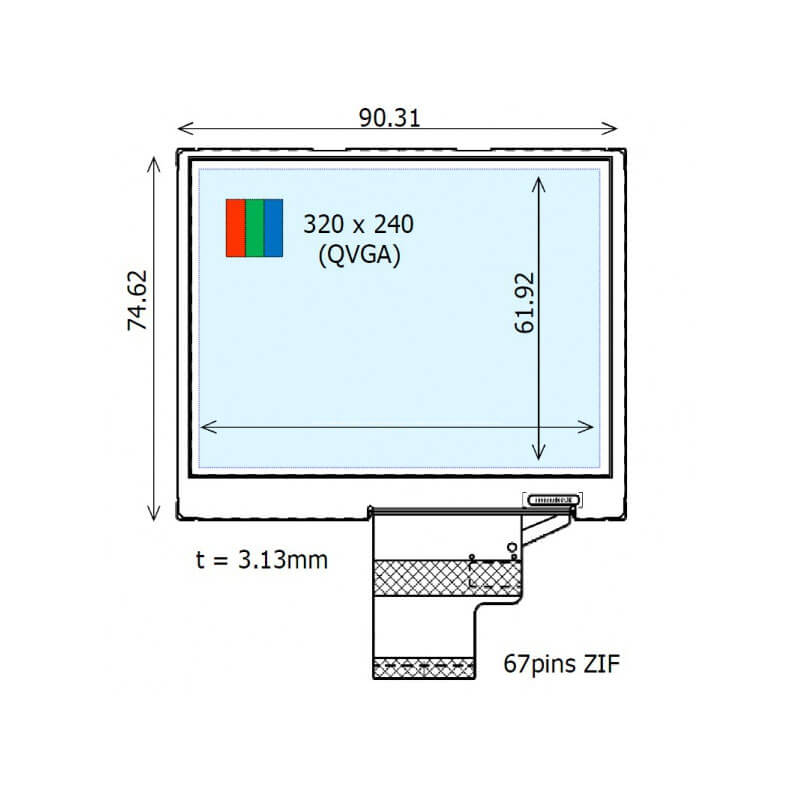 COM41T4148GLC is a 4.1 inch diagonal a-Si TFT-LCD display screen product, with an incorporated WLED lighting system, without backlight driver, without touch screen.COM41T4148GLC supports display 320(RGB)×240 (QVGA) with aspect ratio of 4:3 (W:H), whose pixels are arranged in RGB Vertical Stripe. It features active area of 82.56(W)×61.92(H) mm, outline size of 90.31(W)×74.62(H)×3.38(D) mm, viewing area size of 85.26(W)×64.62(H) mm, with surface treament of Hard coating (3H), net weight of 42.4g (Typ.). As a TN, Normally White, Transmissive LCM product, COM41T4148GLC can provides 450 cd/m² display brightness 200:1 transimissive contrast ratio, 35/35/20/50 (Min.)(CR≥10) (L/R/U/D) viewing angle , and response time of 40/60 (Max.)(Tr/Td) ms. Gray scale or the brightness of the sub-pixel is determined with a 6-bit / 6-bit + Hi-FRC gray scale signal for each dot, thus presenting a palette of 262K/16.7M colors. This product adopted 5S2P WLED as it's backlight systerm which was placed as Edge light type and have a working life time of 50K hours, external backlight driver is additionally needed. COM41T4148GLC utilizes Parallel RGB (1 ch, 6/8-bit) as it's signal inputting systerm, which connected by 67 pins FPC with power supply voltage of 3.0V (Typ.). It's typical vertical frame rate (Fv) is 60Hz.