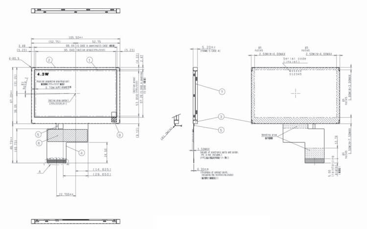 COM43H4N44ULC supports display 480×272(RGB) (WQVGA) with aspect ratio of 16:9 (W:H), whose pixels are arranged in RGB Horizontal Stripe.It features active area of 95.04(W)×53.856(H) mm, outline size of 105.5(W)×67.2(H)×5.4(D) mm, with surface treament of Hard coating (2H), net weight of 62.0g (Typ.). As a VA, Normally Black, Transflective LCM product, COM43H4N44ULC can provides 1100 cd/m² display brightness 600:1 transimissive contrast ratio, 2:1 (Typ.) reflective contrast ratio, 80/80/80/80 (Min.)(CR≥10) (L/R/U/D) viewing angle, best view direction on Symmetry , and response time of 50 (Typ.)(Tr+Td) ms. Gray scale or the brightness of the sub-pixel is determined with a 8-bit gray scale signal for each dot, thus presenting a palette of 16.7M colors, also with performance of color gamut 50% (NTSC). This product adopted 4S2P WLED as it's backlight systerm which was placed as Edge light type and have a working life time of 50K hours, external backlight driver is additionally needed. COM43H4N44ULC utilizes Parallel RGB (1 ch, 8-bit) as it's signal inputting systerm, which connected by 45 pins FPC with power supply voltage of 3.3V (Typ.). It's typical vertical frame rate (Fv) is 60Hz.