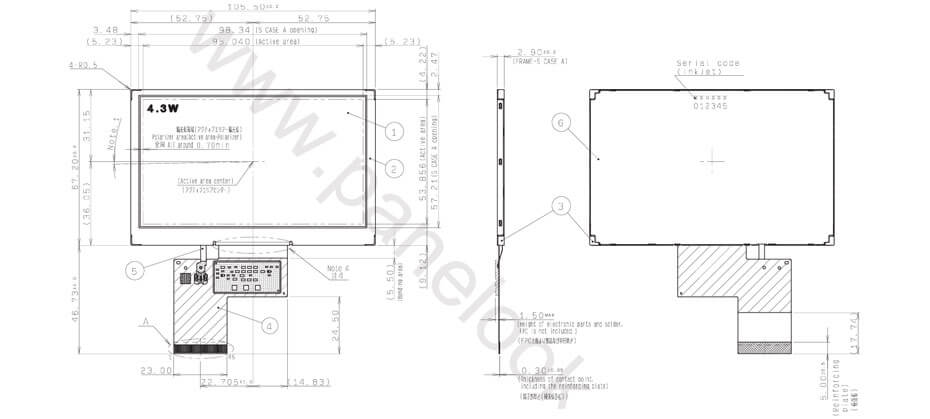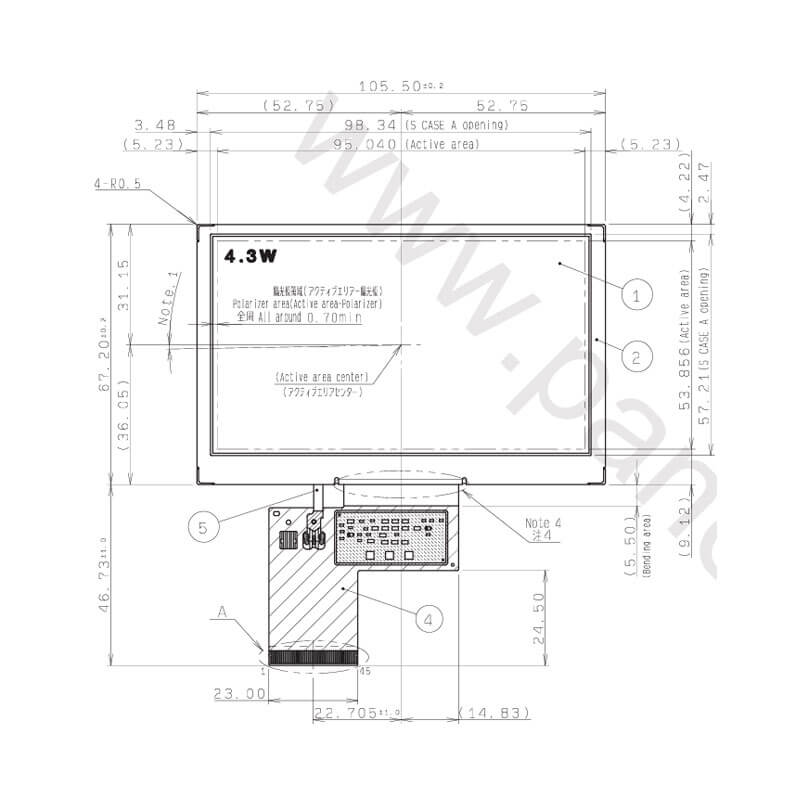 COM43H4P44ULC supports display 480×272(RGB) (WQVGA) with aspect ratio of 16:9 (W:H), whose pixels are arranged in RGB Horizontal Stripe. It features active area of 95.04(W)×53.856(H) mm, outline size of 105.5(W)×67.2(H)×3.1(D) mm, viewing area size of 98.34(W)×57.21(H) mm, net weight of TBD. As a VA, Normally Black, Transflective LCM product, COM43H4P44ULC can provides 450 cd/m² display brightness 800:1 transimissive contrast ratio, 80/80/80/80 (Min.)(CR≥10) (L/R/U/D) viewing angle, best view direction on Symmetry , and response time of TBD ms. Gray scale or the brightness of the sub-pixel is determined with a 8-bit gray scale signal for each dot, thus presenting a palette of 16.7M colors. This product adopted 9S1P WLED as it's backlight systerm which was placed as Edge light type and have a working life time of 50K hours, external backlight driver is additionally needed. COM43H4P44ULC utilizes Parallel RGB (1 ch, 8-bit) as it's signal inputting systerm, which connected by 45 pins FPC with power supply voltage of 3.0V (Typ.). It's typical vertical frame rate (Fv) is 60Hz.