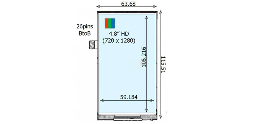 COM48H4P03ULC supports display 720(RGB)×1280 (WXGA) with aspect ratio of 9:16 (W:H), whose pixels are arranged in RGB Vertical Stripe, it's pixel density is 309 PPI. It features active area of 59.184(W)×105.216(H) mm, outline size of 63.68(W)×115.51(H)×2.47(D) mm, with surface treament of Hard coating (2H), net weight of 25.2g (Typ.). As a VA, Normally Black, Transflective LCM product, COM48H4P03ULC can provides 300 cd/m² display brightness 700:1 transimissive contrast ratio, 3:1 (Typ.) reflective contrast ratio, 80/80/80/80 (Min.)(CR≥10) (L/R/U/D) viewing angle, best view direction on Symmetry , and response time of 40/60 (Max.)(Tr/Td) ms. Gray scale or the brightness of the sub-pixel is determined with a 8-bit gray scale signal for each dot, thus presenting a palette of 16.7M colors, also with performance of color gamut 50% (NTSC). This product adopted 9S1P WLED as it's backlight systerm which was placed as Edge light type and have a working life time of 20K hours, external backlight driver is additionally needed. COM48H4P03ULC utilizes MIPI (4 data lanes) as it's signal inputting systerm, which connected by 26 pins Connector with power supply voltage of 1.8/2.9V (Typ.)(IOVCC/VCC).