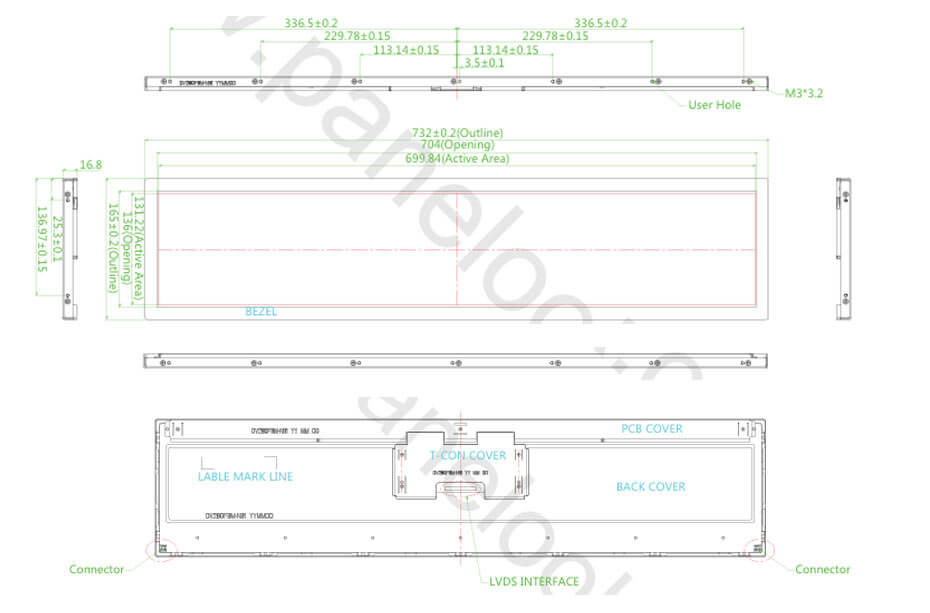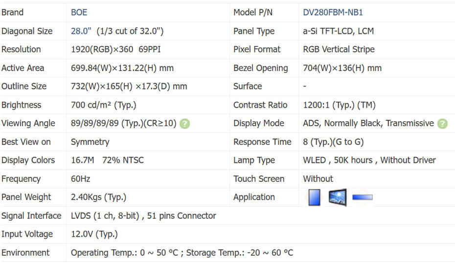 DV280FBM-NB1 is a 28.0" diagonal a-Si TFT-LCD display panel with an integral WLED backlight system, without backlight driver, without touch screen. It features an operating temperature range of 0 ~ 50°C , a storage temperature range of -20 ~ 60°C , and the maximal vibration level of 1.0G (9.8 m/s²). It's general features are summarized in the following: Hight Brightness, WLED Backlight, Life ≥ 50K hours, Bar Display , 1/3 cut of 31.5". Based on its features, Panelook recommend that this model be applied to Digital Signage, Outdoor High Brightness, Stretched Bar LCD etc.