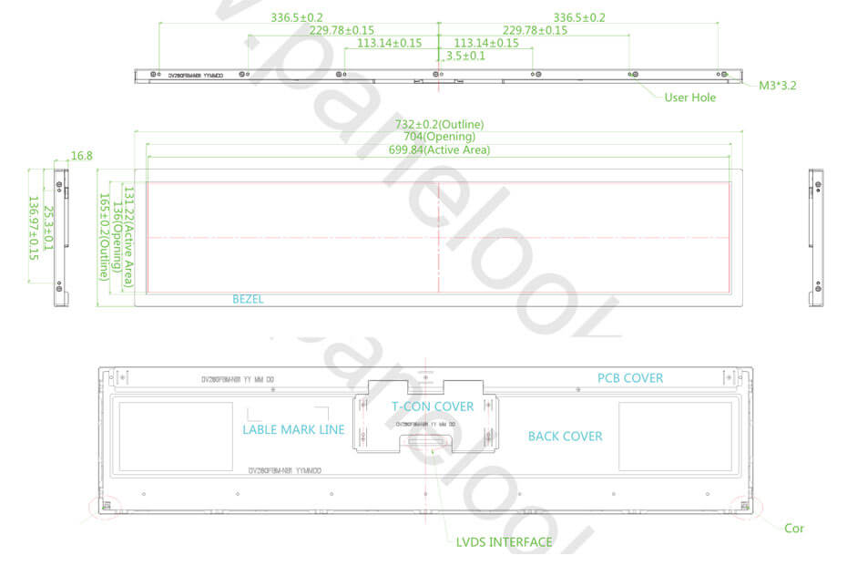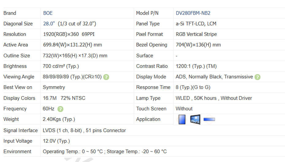 DV280FBM-NB2 is a 28.0 inch diagonal a-Si TFT-LCD display panel with an integral WLED backlight system, without backlight driver, without touch screen. It features an operating temperature range of 0 ~ 50°C , a storage temperature range of -20 ~ 60°C , and the maximal vibration level of 1.0G (9.8 m/s²). It's general features are summarized by Panelook in the following: Hight Brightness, WLED Backlight, Life ≥ 50K hours, Bar Display , 1/3 cut of 31.5".