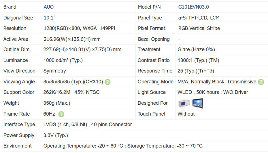 G101EVN03.0 supports display 1280(RGB)×800 (WXGA) with aspect ratio of 16:10 (W:H), whose pixels are arranged in RGB Vertical Stripe. It features active area of 216.96(W)×135.6(H) mm, outline size of 227.69(W)×148.31(H)×7.75(D) mm, with surface treament of Glare (Haze 0%), net weight of 350g (Max.). As a MVA, Normally Black, Transmissive LCM product, G101EVN03.0 can provides 1000 cd/m² display brightness 1300:1 transimissive contrast ratio, 85/85/85/85 (Typ.)(CR≥10) (L/R/U/D) viewing angle, best view direction on Symmetry , and response time of 25 (Typ.)(Tr+Td) ms. Gray scale or the brightness of the sub-pixel is determined with a 6-bit / 6-bit + FRC gray scale signal for each dot, thus presenting a palette of 262K/16.2M colors, also with performance of color gamut 45% (NTSC). This product adopted WLED as it's backlight systerm which was placed as Edge light type and have a working life time of 50K hours, external backlight driver is additionally needed. G101EVN03.0 utilizes LVDS (1 ch, 6/8-bit) as it's signal inputting systerm, which connected by 40 pins Connector with power supply voltage of 3.3V (Typ.). It's typical vertical frame rate (Fv) is 60Hz.