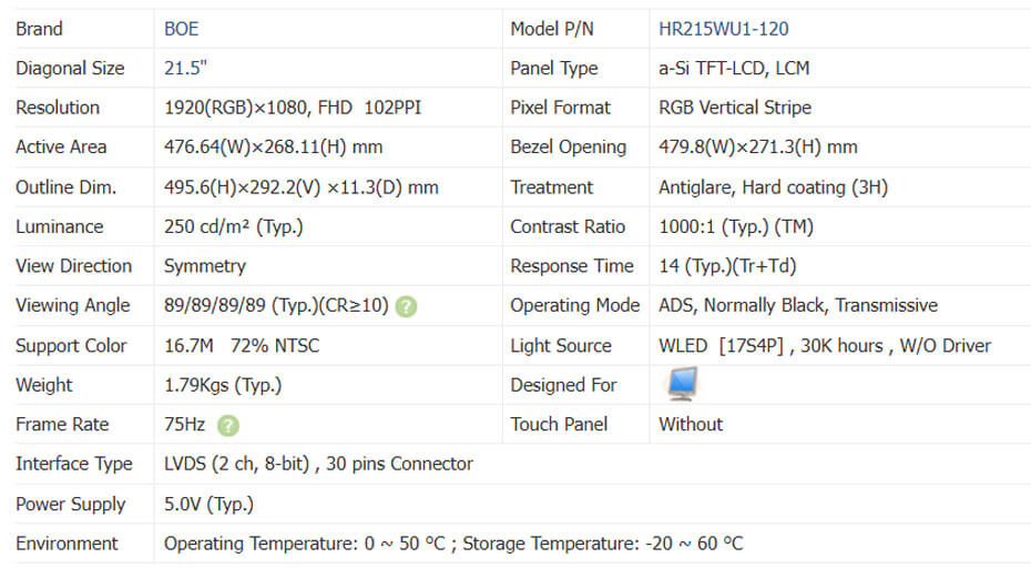 G238HCJ-LH1 supports display 1920(RGB)×1080 (FHD) with aspect ratio of 16:9 (W:H), whose pixels are arranged in RGB Vertical Stripe. It features active area of 527.04(W)×296.46(H) mm, outline size of 543(W)×317.4(H)×19.43(D) mm, viewing area size of 530.2(W)×299.6(H) mm, with surface treament of Antiglare (Haze 25%), Hard coating (3H), net weight of 2.82Kgs (Typ.). As a AAS, Normally Black, Transmissive LCM product, G238HCJ-LH1 can provides 1000 cd/m² display brightness 1000:1 transimissive contrast ratio, 88/88/88/88 (Typ.)(CR≥10) (L/R/U/D) viewing angle, best view direction on Symmetry , and response time of 14/11 (Typ.)(Tr/Td) ms. Gray scale or the brightness of the sub-pixel is determined with a 8-bit gray scale signal for each dot, thus presenting a palette of 16.7M colors, also with performance of color gamut 74% (NTSC). This product adopted WLED as it's backlight systerm which was placed as Edge light type (Top and Bottom) and have a working life time of 50K hours, With LED Driver. G238HCJ-LH1 utilizes LVDS (2 ch, 8-bit) as it's signal inputting systerm, which connected by 30 pins Connector with power supply voltage of 5.0±0.5V. It's typical vertical frame rate (Fv) is 60Hz.