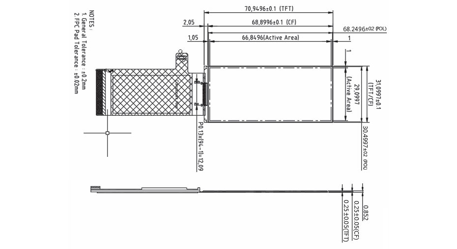 HSD029GPW3-02990A-MX is a 2.9 inch diagonal a-Si TFT-LCD display screen product, without backlight, without touch screen.HSD029GPW3-02990A-MX supports display 210(RGB)×480 with aspect ratio of 9:20 (W:H), whose pixels are arranged in RGB Vertical Stripe. As for mechanical detail, it features active area of 29.0997(W)×66.8496(H) mm, outline size of 31.0997(W)×70.9496(H)×0.86(D) mm, with surface treament of Hard coating, net weight of TBD. As a TN, Normally White, Reflective LCM product, HSD029GPW3-02990A-MX can provides , 15:1 (Typ.) reflective contrast ratio, 60/60/60/60 (Typ.)(CR≥2) (L/R/U/D) viewing angle , and response time of 5 (Typ.)(Tr+Td) ms., thus presenting a palette of 8 colors. This product have no backlight. HSD029GPW3-02990A-MX utilizes 4-wire SPI as it's signal inputting systerm, which connected by 50 pins FPC with power supply voltage of 3.3V (Typ.). It's typical vertical frame rate (Fv) is 1Hz.