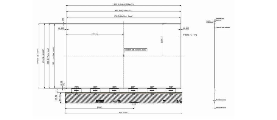 HSD215GUW1-A00-0299 supports display 1920(RGB)×1080 (FHD) with aspect ratio of 16:9 (W:H), whose pixels are arranged in RGB Vertical Stripe. As for mechanical detail, it features active area of 476.64(W)×268.11(H) mm, outline size of 482.616(W)×275.31(H)×1.07(D) mm, with surface treament of Glare (Haze 0%), Hard coating, Antireflection, net weight of TBD. As a IPS, Normally Black, Transflective CELL product, HSD215GUW1-A00-0299 can provides 15:1 transimissive contrast ratio, 15:1 (Typ.) reflective contrast ratio, 65/65/65/65 (Typ.)(CR≥10) (L/R/U/D) viewing angle, best view direction on Symmetry , and response time of 6 (Typ.)(Tr+Td) ms. Gray scale or the brightness of the sub-pixel is determined with a 8-bit gray scale signal for each dot, thus presenting a palette of 16.7M colors. This product have no backlight. HSD215GUW1-A00-0299 utilizes LVDS (2 ch, 8-bit) as it's signal inputting systerm, which connected by 30 pins Connector with power supply voltage of 5.0V (Typ.). It's typical vertical frame rate (Fv) is 60Hz.