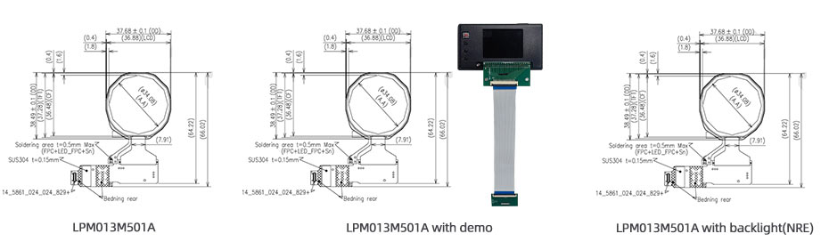 LPM013M501A is a 1.34 inch diagonal a-Si TFT-LCD display screen product from JDI, with a built-in WLED backlight, without backlight driver, without touch screen.LPM013M501A supports display 320(RGB)×320 with aspect ratio of 1:1 (W:H), whose pixels are arranged in RGB Vertical Stripe. It features active area of 34.08(W)×34.08(H) mm, outline size of 37.68(W)×38.49(H)×1.96(D) mm, with surface treament of Hard coating (2H), net weight of TBD. As a ECB, Normally Black, Reflective LCM product, LPM013M501A can provides 10 cd/m² display brightness, 25:1 (Typ.) reflective contrast ratio, 60/65/65/60 (Typ.)(CR≥2) (L/R/U/D) viewing angle , and response time of 3/6 (Typ.)(Tr/Td) ms. Gray scale or the brightness of the sub-pixel is determined with a 6-bit gray scale signal for each dot, thus presenting a palette of 262K colors, also with performance of color gamut 23% (NTSC).