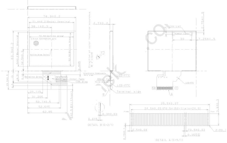 LQ035Q3DG03 supports display 320(RGB)×240 (QVGA) with aspect ratio of 4:3 (W:H), whose pixels are arranged in RGB Vertical Stripe. It features active area of 70.56(W)×52.92(H) mm, outline size of 76.9(W)×63.9(H)×4.9(D) mm, viewing area size of 71.6(W)×54.0(H) mm, with surface treament of Antiglare, net weight of 42.0g (Typ.). As a TN, Normally White, Transmissive LCM product, LQ035Q3DG03 can provides 450 cd/m² display brightness 300:1 transimissive contrast ratio, 60/60/40/60 (Typ.)(CR≥10) (L/R/U/D) viewing angle, best view direction on 6 o'clock , and response time of 30/30 (Typ.)(Tr/Td) ms. Gray scale or the brightness of the sub-pixel is determined with a 8-bit gray scale signal for each dot, thus presenting a palette of 16.7M colors. This product adopted 3S2P WLED as it's backlight systerm which was placed as Edge light type and have a working life time of 50K hours, external backlight driver is additionally needed. LQ035Q3DG03 utilizes Parallel RGB (1 ch, 8-bit) + SPI as it's signal inputting systerm, which connected by 50 pins FPC with power supply voltage of 3.3/3.3V (Typ.)(VDDIO/VCI). It's typical vertical frame rate (Fv) is 60Hz.