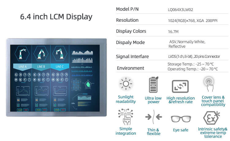 LQ064X3LW02 supports display 1024(RGB)×768 (XGA) with aspect ratio of 4:3 (W:H), whose pixels are arranged in RGB Vertical Stripe.It features active area of 129.792(W)×97.344(H) mm, outline size of 153.4(W)×122(H)×9.9(D) mm, viewing area size of 133.792(W)×101.344(H) mm, with surface treament of Antiglare, Hard coating (3H), net weight of 220g. As a ASV, Normally Black, Transmissive LCM product, LQ064X3LW02 can provides 390 cd/m² display brightness 800:1 transimissive contrast ratio, 80/80/80/80 (Typ.)(CR≥10) (L/R/U/D) viewing angle, best view direction on Symmetry , and response time of 35 (Typ.)(Tr+Td) ms. Gray scale or the brightness of the sub-pixel is determined with a 8-bit gray scale signal for each dot, thus presenting a palette of 16.7M colors. This product adopted WLED as it's backlight systerm which was placed as Edge light type (Top side) and have a working life time of 70K hours, With LED Driver. LQ064X3LW02 utilizes LVDS (1 ch, 8-bit) as it's signal inputting systerm, which connected by 20 pins Connector with power supply voltage of 3.3V (Typ.). It's typical vertical frame rate (Fv) is 60Hz.