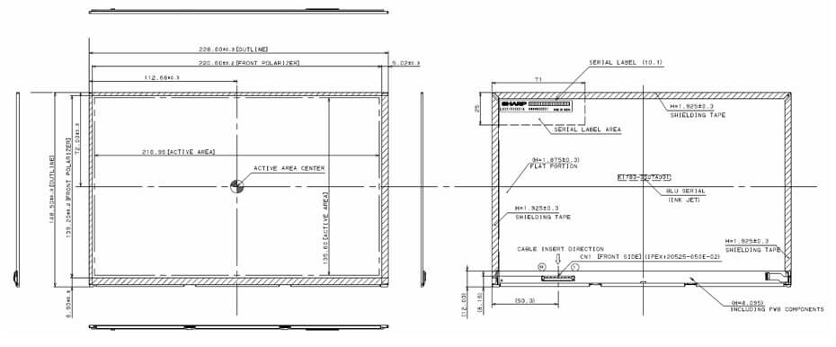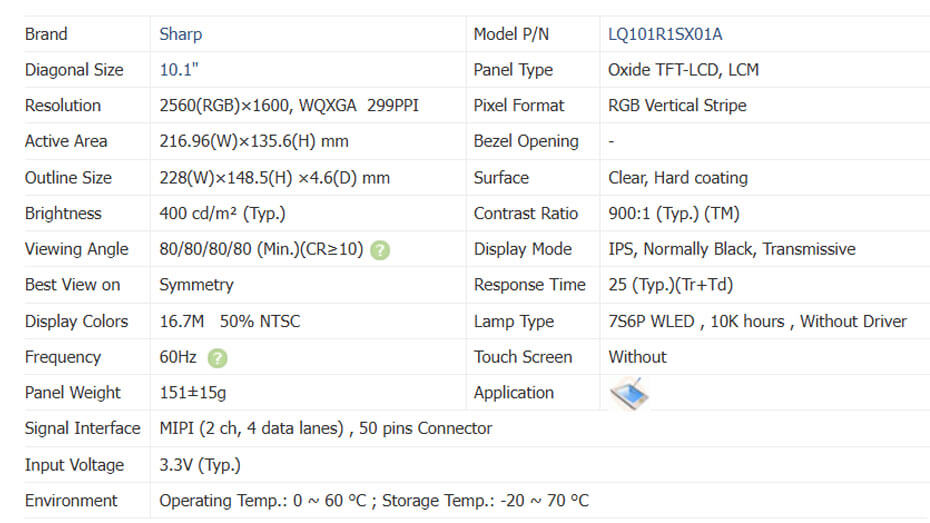 LQ101R1SX01A is a 10.1 inch diagonal Oxide TFT-LCD display screen with an incorporated WLED lighting system, without backlight driver, without touch screen.LQ101R1SX01A supports display 2560(RGB)×1600 (WQXGA) with aspect ratio of 16:10 (W:H), whose pixels are arranged in RGB Vertical Stripe, it's pixel density is 299 PPI. As for mechanical detail, it features active area of 216.96(W)×135.6(H) mm, outline size of 228(W)×148.5(H)×4.6(D) mm, with surface treament of Clear, Hard coating, net weight of 151±15g. As a IPS, Normally Black, Transmissive LCM product, LQ101R1SX01A can provides 400 cd/m² display brightness 900:1 transimissive contrast ratio, 80/80/80/80 (Min.)(CR≥10) (L/R/U/D) viewing angle, best view direction on Symmetry , and response time of 25 (Typ.)(Tr+Td) ms. Gray scale or the brightness of the sub-pixel is determined with a 8-bit gray scale signal for each dot, thus presenting a palette of 16.7M colors, also with performance of color gamut 50% (NTSC). This product adopted 7S6P WLED as it's backlight systerm which was placed as Edge light type and have a working life time of 10K hours, external backlight driver is additionally needed. LQ101R1SX01A utilizes MIPI (2 ch, 4 data lanes) as it's signal inputting systerm, which connected by 50 pins Connector with power supply voltage of 3.3V (Typ.). It's typical vertical frame rate (Fv) is 60Hz.