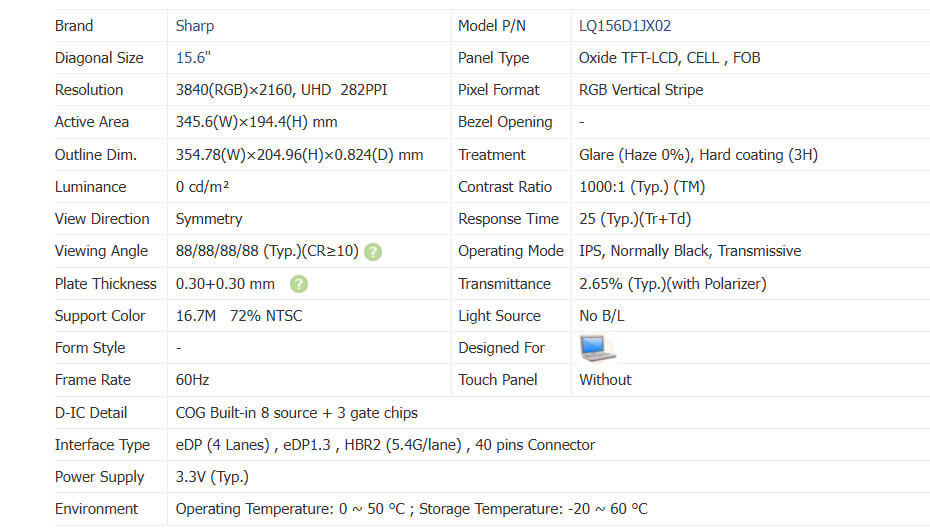 LQ156D1JX02 supports display 3840(RGB)×2160 (UHD) with aspect ratio of 16:9 (W:H), whose pixels are arranged in RGB Vertical Stripe, it's pixel density is 282 PPI. As for mechanical detail, it features active area of 345.6(W)×194.4(H) mm, outline size of 354.78(W)×204.96(H)×0.824(D) mm, with surface treament of Glare (Haze 0%), Hard coating (3H), net weight of TBD, utilizing 0.30+0.30 mm mm plate. As a IPS, Normally Black, Transmissive CELL product, LQ156D1JX02 can provides 1000:1 transimissive contrast ratio, 88/88/88/88 (Typ.)(CR≥10) (L/R/U/D) viewing angle, best view direction on Symmetry , and response time of 25 (Typ.)(Tr+Td) ms. Gray scale or the brightness of the sub-pixel is determined with a 8-bit gray scale signal for each dot, thus presenting a palette of 16.7M colors, also with performance of color gamut 72% (NTSC). This product have no backlight. LQ156D1JX02 utilizes eDP (4 Lanes) as it's signal inputting systerm, which connected by 40 pins Connector with power supply voltage of 3.3V (Typ.). It's typical vertical frame rate (Fv) is 60Hz.