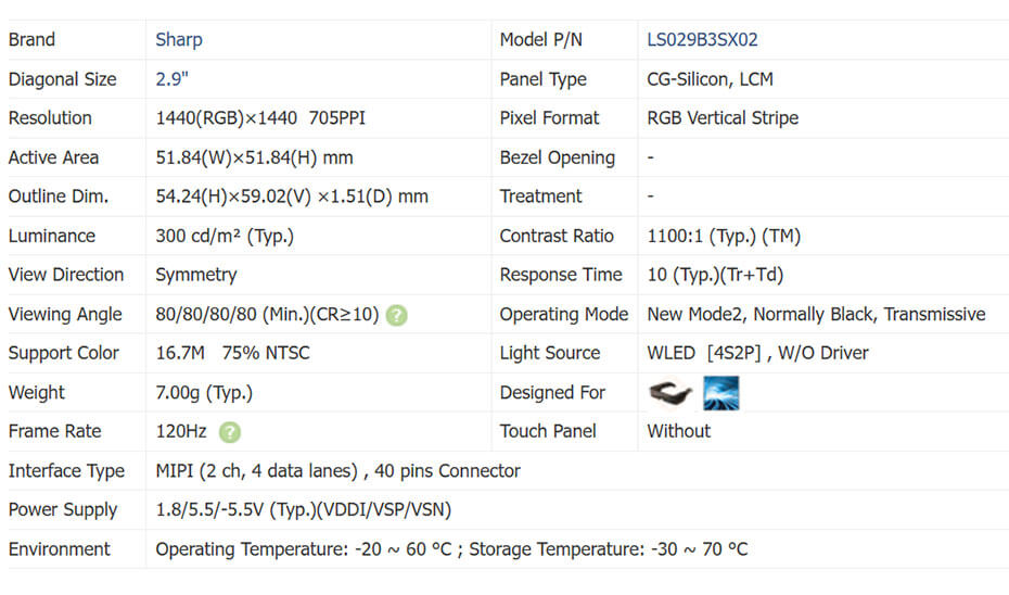 LS029B3SX02 is a 2.9 inch diagonal CG-Silicon display screen product from Sharp, with a built-in WLED backlight, without backlight driver, without touch screen.LS029B3SX02 supports display 1440(RGB)×1440 with aspect ratio of 1:1 (W:H), whose pixels are arranged in RGB Vertical Stripe, according to calculation of Panelook it's pixel density is 705 PPI. As for mechanical detail, it features active area of 51.84(W)×51.84(H) mm, outline size of 54.24(W)×59.02(H)×1.51(D) mm, net weight of 7.00g (Typ.). As a New Mode2, Normally Black, Transmissive LCM product, LS029B3SX02 can provides 300 cd/m² display brightness 1100:1 transimissive contrast ratio, 80/80/80/80 (Min.)(CR≥10) (L/R/U/D) viewing angle, best view direction on Symmetry , and response time of 10 (Typ.)(Tr+Td) ms. Gray scale or the brightness of the sub-pixel is determined with a 8-bit gray scale signal for each dot, thus presenting a palette of 16.7M colors, also with performance of color gamut 75% (NTSC).
