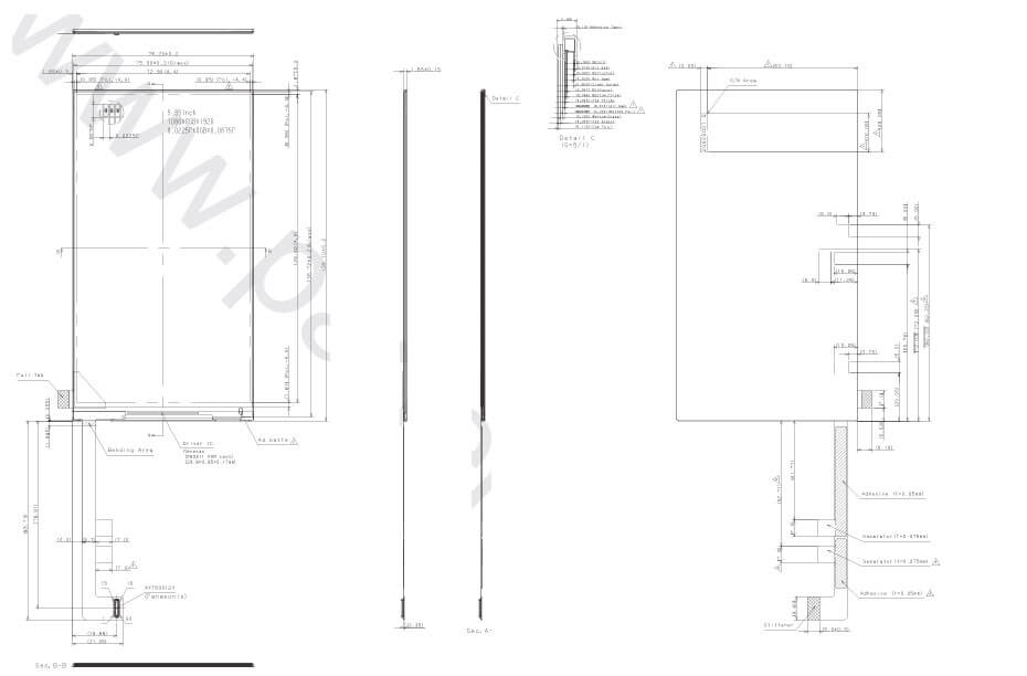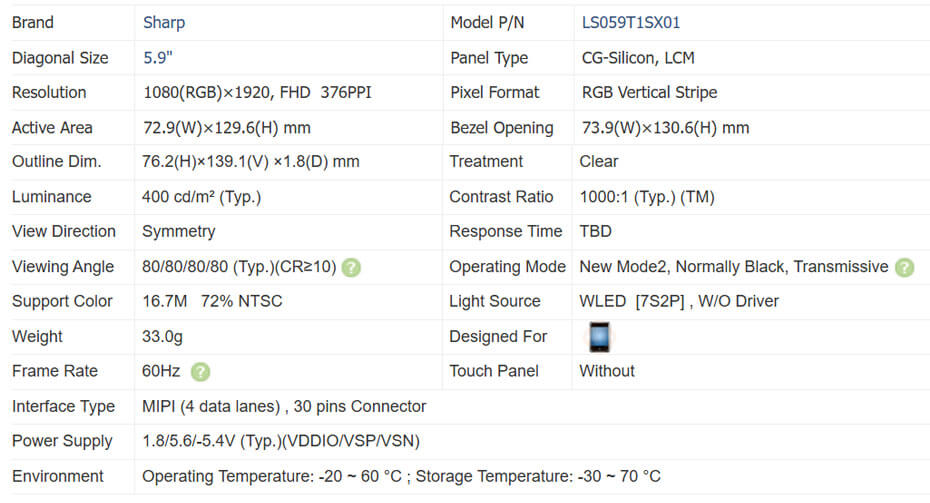 LS059T1SX01 is a 5.9 inch diagonal CG-Silicon display screen with a built-in WLED backlight, without backlight driver, without touch screen. LS059T1SX01 supports display 1080(RGB)×1920 (FHD) with aspect ratio of 9:16 (W:H), whose pixels are arranged in RGB Vertical Stripe, according to calculation of Panelook it's pixel density is 376 PPI. As for mechanical detail, it features active area of 72.9(W)×129.6(H) mm, outline size of 76.2(W)×139.1(H)×1.8(D) mm, viewing area size of 73.9(W)×130.6(H) mm, with surface treament of Clear, net weight of 33.0g. As a New Mode2, Normally Black, Transmissive LCM product, LS059T1SX01 can provides 400 cd/m² display brightness 1000:1 transimissive contrast ratio, 80/80/80/80 (Typ.)(CR≥10) (L/R/U/D) viewing angle, best view direction on Symmetry , and response time of TBD ms. Gray scale or the brightness of the sub-pixel is determined with a 8-bit gray scale signal for each dot, thus presenting a palette of 16.7M colors, also with performance of color gamut 72% (NTSC). This product adopted 7S2P WLED as it's backlight systerm which was placed as Edge light type, external backlight driver is additionally needed. LS059T1SX01 utilizes MIPI (4 data lanes) as it's signal inputting systerm, which connected by 30 pins Connector with power supply voltage of 1.8/5.6/-5.4V (Typ.)(VDDIO/VSP/VSN). It's typical vertical frame rate (Fv) is 60Hz.