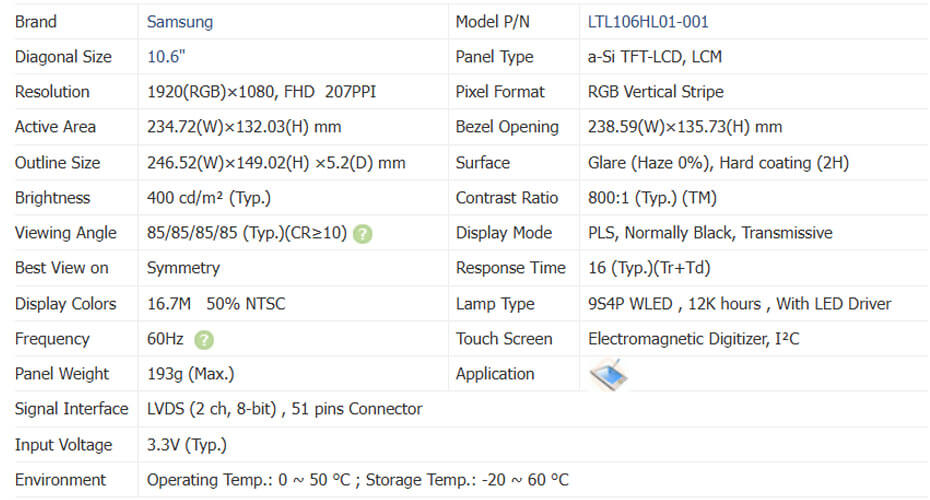 LTL106HL01-001 supports display 1920(RGB)×1080 (FHD) with aspect ratio of 16:9 (W:H), whose pixels are arranged in RGB Vertical Stripe. It features active area of 234.72(W)×132.03(H) mm, outline size of 246.52(W)×149.02(H)×5.2(D) mm, viewing area size of 238.59(W)×135.73(H) mm, with surface treament of Glare (Haze 0%), Hard coating (2H), net weight of 193g (Max.). As a PLS, Normally Black, Transmissive LCM product, LTL106HL01-001 can provides 400 cd/m² display brightness 800:1 transimissive contrast ratio, 85/85/85/85 (Typ.)(CR≥10) (L/R/U/D) viewing angle, best view direction on Symmetry , and response time of 16 (Typ.)(Tr+Td) ms. Gray scale or the brightness of the sub-pixel is determined with a 8-bit gray scale signal for each dot, thus presenting a palette of 16.7M colors, also with performance of color gamut 50% (NTSC). This product adopted 9S4P WLED as it's backlight systerm which was placed as Edge light type and have a working life time of 12K hours, With LED Driver. LTL106HL01-001 utilizes LVDS (2 ch, 8-bit) as it's signal inputting systerm, which connected by 51 pins Connector with power supply voltage of 3.3V (Typ.). It's typical vertical frame rate (Fv) is 60Hz.