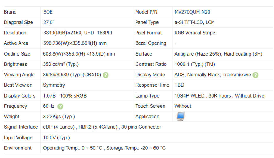 MV270QUM-N20 is a 27.0 inch diagonal a-Si TFT-LCD display screen product, with an incorporated WLED lighting system, without backlight driver, without touch screen.MV270QUM-N20 supports display 3840(RGB)×2160 (UHD) with aspect ratio of 16:9 (W:H), whose pixels are arranged in RGB Vertical Stripe. It features active area of 596.736(W)×335.664(H) mm, outline size of 608.8(W)×353.3(H)×13.9(D) mm, with surface treament of Antiglare (Haze 25%), Hard coating (3H), net weight of 3.22Kgs (Typ.). As a ADS, Normally Black, Transmissive LCM product, MV270QUM-N20 can provides 350 cd/m² display brightness 1000:1 transimissive contrast ratio, 89/89/89/89 (Typ.)(CR≥10) (L/R/U/D) viewing angle, best view direction on Symmetry , and response time of TBD ms. Gray scale or the brightness of the sub-pixel is determined with a 8-bit + Hi-FRC gray scale signal for each dot, thus presenting a palette of 1.07B colors, also with performance of color gamut 100% (sRGB). This product adopted 19S4P WLED as it's backlight systerm which was placed as Edge light type (Bottom side) and have a working life time of 30K hours, external backlight driver is additionally needed. MV270QUM-N20 utilizes eDP (4 Lanes) as it's signal inputting systerm, which connected by 30 pins Connector with power supply voltage of 10.0V (Typ.). It's typical vertical frame rate (Fv) is 60Hz.