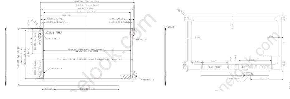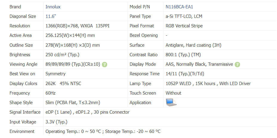 N116BCA-EA1 supports display 1366(RGB)×768 (WXGA) with aspect ratio of 16:9 (W:H), whose pixels are arranged in RGB Vertical Stripe. It features active area of 256.125(W)×144(H) mm, outline size of 278(W)×168(H)×3(D) mm, with surface treament of Antiglare, Hard coating (3H), net weight of 200g (Max.), shape stype of Slim (PCBA Flat, T≤3.2mm). As a AAS, Normally Black, Transmissive LCM product, N116BCA-EA1 can provides 250 cd/m² display brightness 800:1 transimissive contrast ratio, 89/89/89/89 (Typ.)(CR≥10) (L/R/U/D) viewing angle, best view direction on Symmetry , and response time of 14/11 (Typ.)(Tr/Td) ms. Gray scale or the brightness of the sub-pixel is determined with a 6-bit gray scale signal for each dot, thus presenting a palette of 262K colors, also with performance of color gamut 45% (NTSC). This product adopted 10S2P WLED as it's backlight systerm which was placed as Edge light type and have a working life time of 15K hours, With LED Driver. N116BCA-EA1 utilizes eDP (1 Lane) as it's signal inputting systerm, which connected by 30 pins Connector with power supply voltage of 3.3V (Typ.). It's typical vertical frame rate (Fv) is 60Hz.