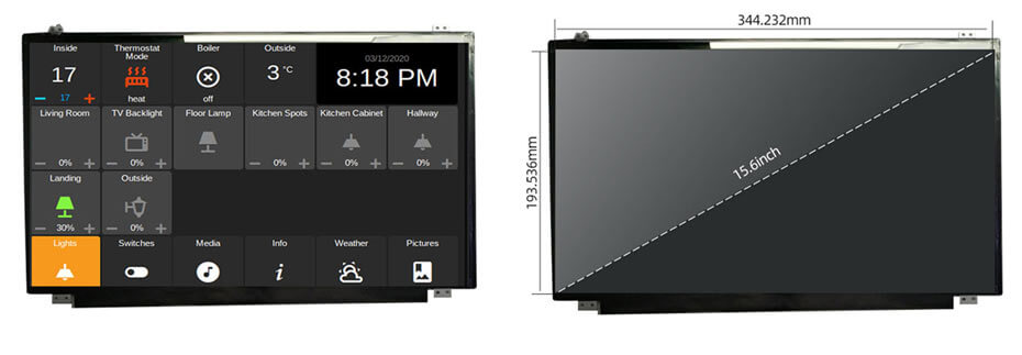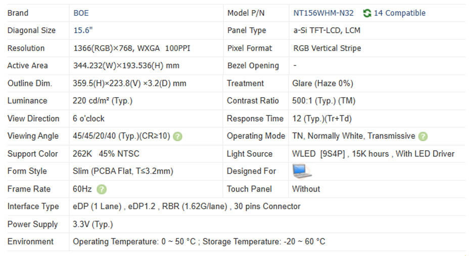 NT156WHM-N32 supports display 1366(RGB)×768 (WXGA) with aspect ratio of 16:9 (W:H), whose pixels are arranged in RGB Vertical Stripe. It features active area of 344.232(W)×193.536(H) mm, outline size of 359.5(W)×223.8(H)×3.2(D) mm, with surface treament of Glare (Haze 0%), net weight of 370g (Max.), shape stype of Slim (PCBA Flat, T≤3.2mm). As a TN, Normally White, Transmissive LCM product, NT156WHM-N32 can provides 220 cd/m² display brightness 500:1 transimissive contrast ratio, 45/45/20/40 (Typ.)(CR≥10) (L/R/U/D) viewing angle, best view direction on 6 o'clock , and response time of 12 (Typ.)(Tr+Td) ms. Gray scale or the brightness of the sub-pixel is determined with a 6-bit gray scale signal for each dot, thus presenting a palette of 262K colors, also with performance of color gamut 45% (NTSC). This product adopted 9S4P WLED as it's backlight systerm which was placed as Edge light type (Bottom side) and have a working life time of 15K hours, With LED Driver. NT156WHM-N32 utilizes eDP (1 Lane) as it's signal inputting systerm, which connected by 30 pins Connector with power supply voltage of 3.3V (Typ.). It's typical vertical frame rate (Fv) is 60Hz.
