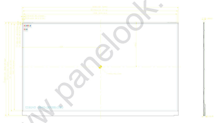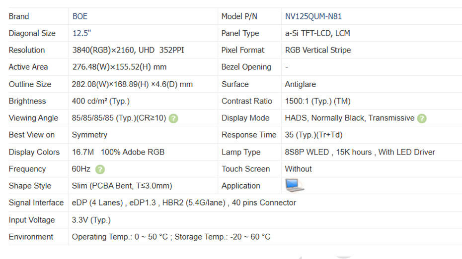 NV125QUM-N81 is a 12.5 inch diagonal a-Si TFT-LCD display screen product, with an incorporated WLED lighting system, With LED Driver, without touch screen.NV125QUM-N81 supports display 3840(RGB)×2160 (UHD) with aspect ratio of 16:9 (W:H), whose pixels are arranged in RGB Vertical Stripe, according to calculation of Panelook it's pixel density is 352 PPI. As for mechanical detail, it features active area of 276.48(W)×155.52(H) mm, outline size of 282.08(W)×168.89(H)×4.6(D) mm, with surface treament of Antiglare, net weight of 185g (Max.), shape stype of Slim (PCBA Bent, T≤3.0mm). As a HADS, Normally Black, Transmissive LCM product, NV125QUM-N81 can provides 400 cd/m² display brightness 1500:1 transimissive contrast ratio, 85/85/85/85 (Typ.)(CR≥10) (L/R/U/D) viewing angle, best view direction on Symmetry , and response time of 35 (Typ.)(Tr+Td) ms. Gray scale or the brightness of the sub-pixel is determined with a 8-bit gray scale signal for each dot, thus presenting a palette of 16.7M colors, also with performance of color gamut 100% (Adobe). This product adopted 8S8P WLED as it's backlight systerm which was placed as Edge light type and have a working life time of 15K hours, With LED Driver. NV125QUM-N81 utilizes eDP (4 Lanes) as it's signal inputting systerm, which connected by 40 pins Connector with power supply voltage of 3.3V (Typ.). It's typical vertical frame rate (Fv) is 60Hz.
