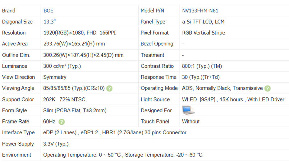 NV133FHM-N61 is a 13.3 inch diagonal a-Si TFT-LCD display panel product, with an integral WLED backlight system, With LED Driver , without touch screen. It features an operating temperature range of 0 ~ 50°C , a storage temperature range of -20 ~ 60°C . It's general features are summarized by Panelook in the following: WLED Backlight, With LED Driver, Reverse I/F , eDP1.2.