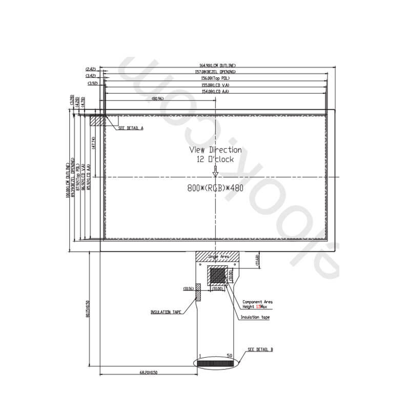 P0700WVN1MB01 supports display 800(RGB)×480 (WVGA) with aspect ratio of 16:9 (W:H), whose pixels are arranged in RGB Vertical Stripe. It features active area of 154.08(W)×85.92(H) mm, outline size of 164.9(W)×100(H)×6(D) mm, with surface treament of Antiglare, net weight of 160g. As a TN, Normally White, Transmissive LCM product, P0700WVN1MB01 can provides 450 cd/m² display brightness 800:1 transimissive contrast ratio, 80/80/60/80 (Typ.)(CR≥10) (L/R/U/D) viewing angle, best view direction on 6 o'clock , and response time of 15 (Typ.)(Tr+Td) ms. Gray scale or the brightness of the sub-pixel is determined with a 8-bit gray scale signal for each dot, thus presenting a palette of 16.7M colors, also with performance of color gamut 50% (NTSC). This product adopted 3S8P WLED as it's backlight systerm which was placed as Edge light type and have a working life time of 45K hours, external backlight driver is additionally needed. P0700WVN1MB01 utilizes TTL (1 ch, 8-bit) as it's signal inputting systerm, which connected by 50 pins FPC with power supply voltage of 3.3/10.4/16/-7V (Typ.)(VCC/AVDD/VGH/VGL). It's typical vertical frame rate (Fv) is 60Hz.