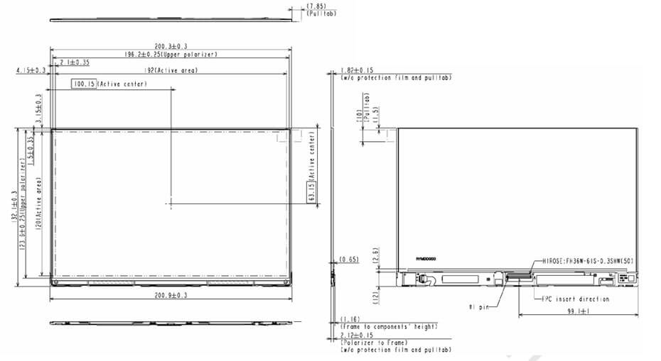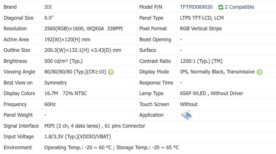 TFTMD089030 is a 8.9 inch diagonal LTPS TFT-LCD display screen product from JDI, with a built-in WLED backlight, without backlight driver, without touch screen. TFTMD089030 supports display 2560(RGB)×1600 (WQXGA) with aspect ratio of 16:10 (W:H), whose pixels are arranged in RGB Vertical Stripe, according to calculation of Panelook it's pixel density is 338 PPI. As for mechanical detail, it features active area of 192(W)×120(H) mm, outline size of 200.3(W)×132.1(H)×3.43(D) mm. As a IPS, Normally Black, Transmissive LCM product, TFTMD089030 can provides 500 cd/m² display brightness 1200:1 transimissive contrast ratio, 80/80/80/80 (Typ.)(CR≥10) (L/R/U/D) viewing angle, best view direction on Symmetry . Gray scale or the brightness of the sub-pixel is determined with a 8-bit gray scale signal for each dot, thus presenting a palette of 16.7M colors, also with performance of color gamut 72% (NTSC). This product adopted 6S6P WLED as it's backlight systerm which was placed as Edge light type, external backlight driver is additionally needed. TFTMD089030 utilizes MIPI (2 ch, 4 data lanes) as it's signal inputting systerm, which connected by 61 pins Connector with power supply voltage of 1.8/3.3V (Typ.)(VDDIO/VBAT). It's typical vertical frame rate (Fv) is 60Hz.