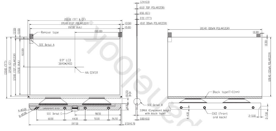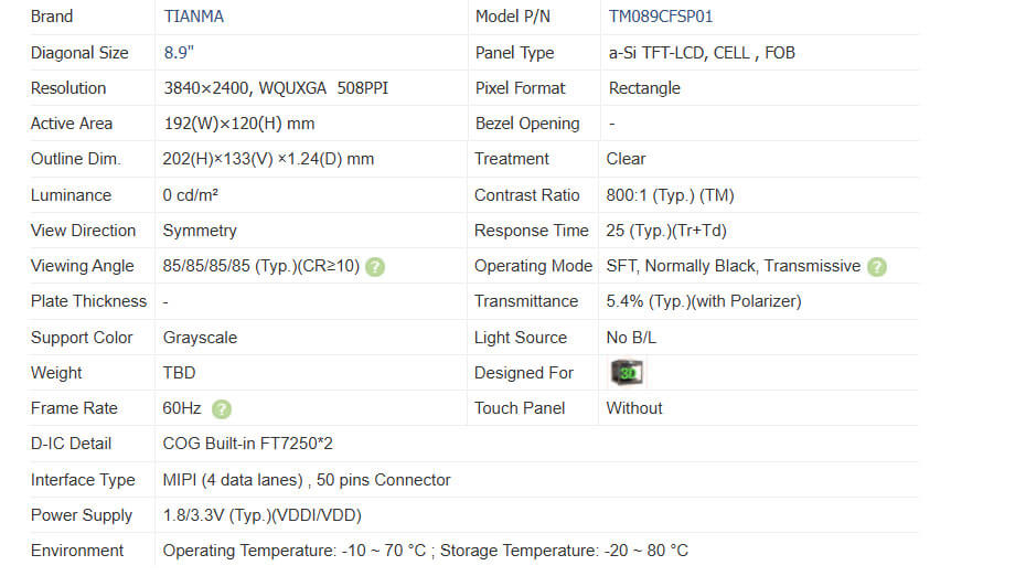 TM089CFSP01 supports display 3840×2400 (WQUXGA) with aspect ratio of 16:10 (W:H), whose pixels are arranged in Rectangle, it's pixel density is 508 PPI. As for mechanical detail, it features active area of 192(W)×120(H) mm, outline size of 202(W)×133(H)×1.24(D) mm, with surface treament of Clear, net weight of TBD. As a SFT, Normally Black, Transmissive CELL product, TM089CFSP01 can provides 800:1 transimissive contrast ratio, 85/85/85/85 (Typ.)(CR≥10) (L/R/U/D) viewing angle, best view direction on Symmetry , and response time of 25 (Typ.)(Tr+Td) ms. Gray scale or the brightness of the sub-pixel is determined with a 8-bit gray scale signal for each dot, thus presenting a palette of Grayscale colors. This product have no backlight. TM089CFSP01 utilizes MIPI (4 data lanes) as it's signal inputting systerm, which connected by 50 pins Connector with power supply voltage of 1.8/3.3V (Typ.)(VDDI/VDD). It's typical vertical frame rate (Fv) is 60Hz.
