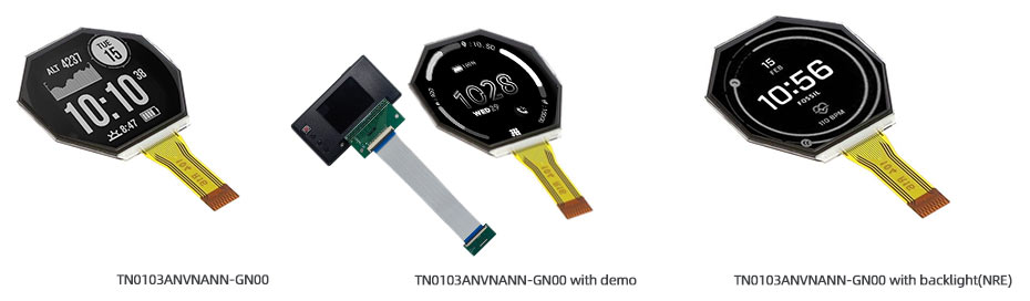 TN0103ANVNANN-GN00 is a 1.0 inch diagonal a-Si TFT-LCD display screen product, without backlight, without touch screen. TN0103ANVNANN-GN00 supports display 128×128 with aspect ratio of 1:1 (W:H), whose pixels are arranged in Rectangle. It features active area of 18.56(W)×18.56(H) mm, outline size of 21.96(W)×24.26(H)×1.71(D) mm, with surface treament of Glare (Haze 0%), net weight of 2.00g (Typ.). As a ECB, Normally Black, Reflective LCM product, TN0103ANVNANN-GN00 can provides , 35:1 (Typ.) reflective contrast ratio, 60/60/60/60 (Typ.)(CR≥2) (L/R/U/D) viewing angle , and response time of 6/7 (Typ.)(Tr/Td) ms. Gray scale or the brightness of the sub-pixel is determined with a 1-bit gray scale signal for each dot, thus presenting a palette of Monochrome colors. This product have no backlight. TN0103ANVNANN-GN00 utilizes 3-wire SPI as it's signal inputting systerm, which connected by 10 pins FPC with power supply voltage of 3.3V (Typ.).