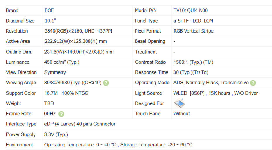 TV101QUM-N00 supports display 3840(RGB)×2160 (UHD) with aspect ratio of 16:9 (W:H), whose pixels are arranged in RGB Vertical Stripe,it's pixel density is 437 PPI. As for mechanical detail, it features active area of 222.912(W)×125.388(H) mm, outline size of 231.6(W)×140.9(H)×2.03(D) mm, net weight of TBD. As a ADS, Normally Black, Transmissive LCM product, TV101QUM-N00 can provides 450 cd/m² display brightness 1500:1 transimissive contrast ratio, 80/80/80/80 (Typ.)(CR≥10) (L/R/U/D) viewing angle, best view direction on Symmetry , and response time of 30 (Typ.)(Tr+Td) ms. Gray scale or the brightness of the sub-pixel is determined with a 8-bit gray scale signal for each dot, thus presenting a palette of 16.7M colors, also with performance of color gamut 100% (NTSC). This product adopted 8S6P WLED as it's backlight systerm which was placed as Edge light type and have a working life time of 15K hours, external backlight driver is additionally needed. TV101QUM-N00 utilizes eDP (4 Lanes) as it's signal inputting systerm, which connected by 40 pins Connector with power supply voltage of 3.3V (Typ.). It's typical vertical frame rate (Fv) is 60Hz.