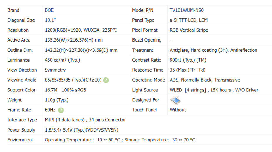 TV101WUM-NS0 supports display 1200(RGB)×1920 (WUXGA) with aspect ratio of 10:16 (W:H), whose pixels are arranged in RGB Vertical Stripe. It features active area of 135.36(W)×216.576(H) mm, outline size of 142.32(W)×227.38(H)×3.69(D) mm, with surface treament of Antiglare, Hard coating (3H), Antireflection, net weight of 110g (Typ.). As a ADS, Normally Black, Transmissive LCM product, TV101WUM-NS0 can provides 450 cd/m² display brightness 900:1 transimissive contrast ratio, 85/85/85/85 (Typ.)(CR≥10) (L/R/U/D) viewing angle, best view direction on Symmetry , and response time of 35 (Max.)(Tr+Td) ms. Gray scale or the brightness of the sub-pixel is determined with a 8-bit gray scale signal for each dot, thus presenting a palette of 16.7M colors, also with performance of color gamut 100% (sRGB). This product adopted 4 strings WLED as it's backlight systerm which was placed as Edge light type and have a working life time of 15K hours, external backlight driver is additionally needed. TV101WUM-NS0 utilizes MIPI (4 data lanes) as it's signal inputting systerm, which connected by 34 pins Connector with power supply voltage of 1.8/5.4/-5.4V (Typ.)(VDD/VSP/VSN). It's typical vertical frame rate (Fv) is 60Hz.