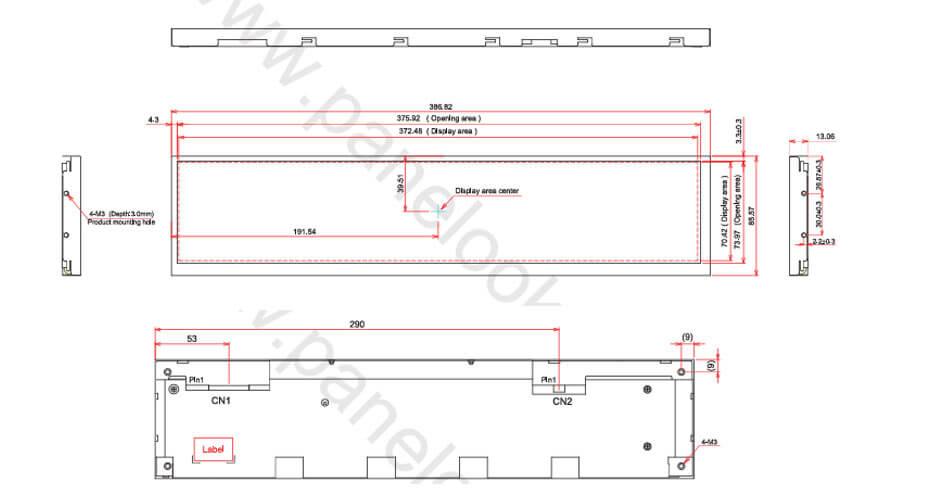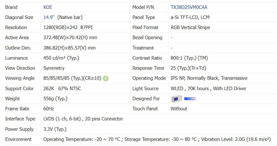 TX38D25VM0CAA supports display 1280(RGB)×242 with aspect ratio of >3:1 (W:H), whose pixels are arranged in RGB Vertical Stripe. It features active area of 372.48(W)×70.42(H) mm, outline size of 386.82(W)×85.57(H) mm, net weight of 556g (Typ.). As a IPS NP, Normally Black, Transmissive LCM product, TX38D25VM0CAA can provides 450 cd/m² display brightness 800:1 transimissive contrast ratio, 85/85/85/85 (Typ.)(CR≥10) (L/R/U/D) viewing angle, best view direction on Symmetry , and response time of 25 (Typ.)(Tr+Td) ms. Gray scale or the brightness of the sub-pixel is determined with a 6-bit gray scale signal for each dot, thus presenting a palette of 262K colors, also with performance of color gamut 67% (NTSC). This product adopted WLED as it's backlight systerm which was placed as Edge light type and have a working life time of 70K hours, With LED Driver. TX38D25VM0CAA utilizes LVDS (1 ch, 6-bit) as it's signal inputting systerm, which connected by 20 pins Connector with power supply voltage of 3.3V (Typ.). It's typical vertical frame rate (Fv) is 60Hz.